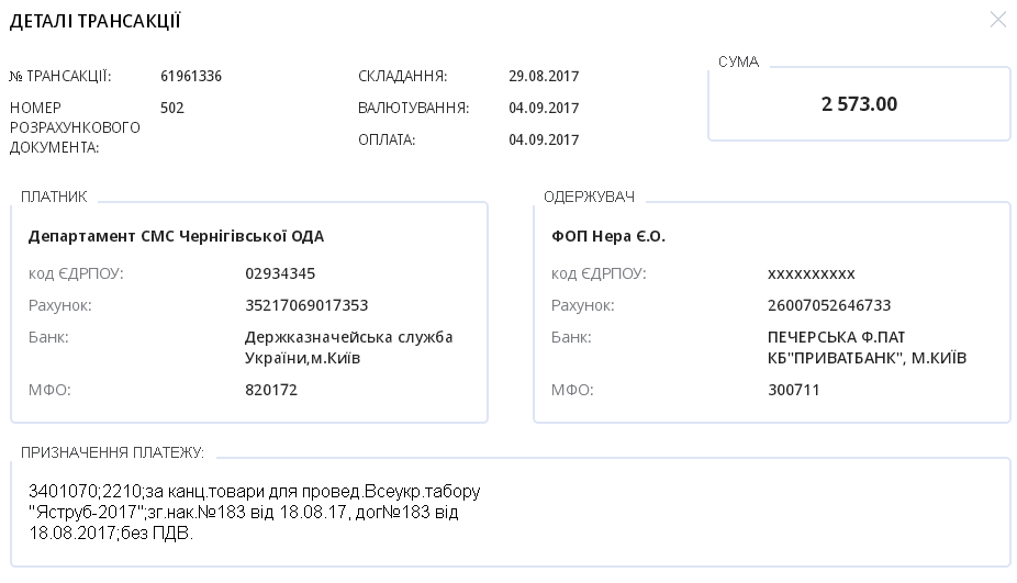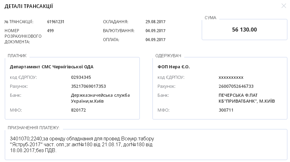 Согласно данным портала бюджетных средств "Е-дата", на мероприятие было потрачено больше 80 тыс грн, из них 63 тыс ушло киевской предпринимательнице Нере Е.А. за аренду оборудования, канцтовары и прочую мелочевку: