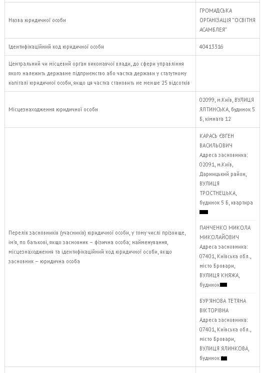 Соучредители "Освітньої асамблеї" уже упомянутый Евгений Карась, а также Николай Панченко и Татьяна Бурьянова. Николай Панченко числится руководителем, а Евгений Карась имеет право подписывать все документы организации: