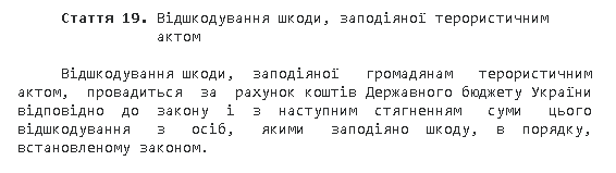 Обязанность государства компенсировать ущерб от терроризма зафиксирована в статье 19 закона "О борьбе с терроризмом":