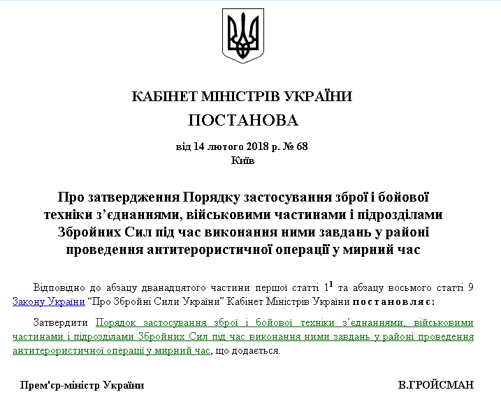 На днях Кабмин утвердил порядок применения оружия Вооруженными силами в зоне антитеррористической операции (АТО) в мирное время. Это сделано спустя почти четыре года после начала АТО на Донбассе. Соответствующий документ 14 февраля постановлением №68 утвердил Кабмин: