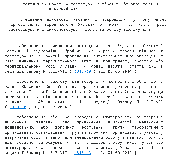 Случаи, когда Вооруженные силы Украины имеют право применять оружие, перечислены в статье 1-1 соответствующего закона. Там указаны несколько возможных вариантов применения оружия в мирное время: при нападении на воинскую часть, для противодействия террористическому акту в ходе АТО, и некоторые другие: