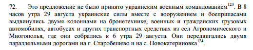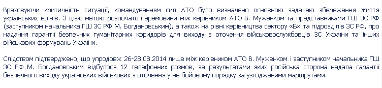 Это не соответствует и версии Генпрокуратуры, которая 14 августа прошлого года сообщила, что по итогам разговоров начальника Генштаба ВСУ В. Муженко и замначальника Генштаба ВС РФ М. Богдановского были даны гарантии безопасного выхода украинских военных из окружения в не боевом порядке по согласованным маршрутам: