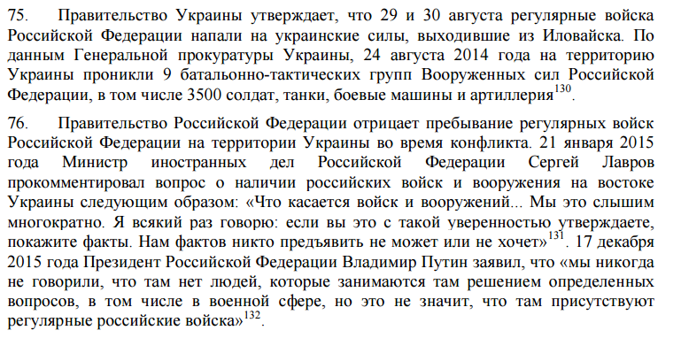В докладе ООН говорится, что правительство Украины утверждает: на украинские силы, выходившие из Иловайска, напали российские регулярные войска. В то же время правительство Российской Федерации отрицает пребывание своих регулярных войск на территории Украины во время конфликта: