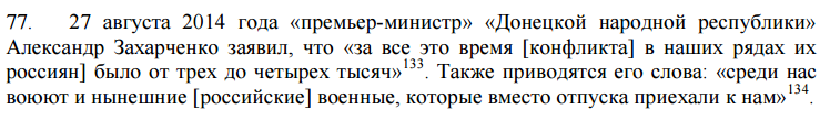 В докладе приводятся слова "премьер-министра" т. н. "ДНР" Александра Захарченко, который 27 августа 2014 года заявил, что "за все это время [конфликта] в наших рядах их [россиян] было от трех до четырех тысяч" . Также, со ссылкой на ТАСС, в докладе ООН приводятся его слова: "среди нас воюют и нынешние [российские] военные, которые вместо отпуска приехали к нам":