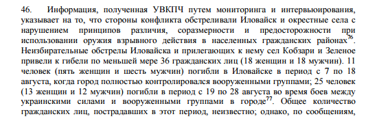 Мониторинговая миссия ООН по правам человека в Украине (далее – миссия ООН) задокументировала многочисленные нарушения во время событий в Иловайске. В докладе сделан вывод, что серьезные нарушения прав человека и международного гуманитарного права совершали все стороны конфликта.