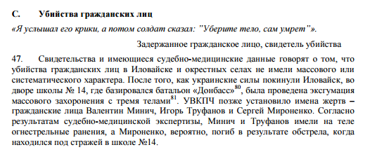 Миссия ООН получила многочисленные сообщения о том, что во время событий под Иловайском стороны конфликта были причастны к убийствам гражданских лиц. Во дворе иловайской школы №14, где базировался батальон "Донбасс", обнаружили массовое захоронение: