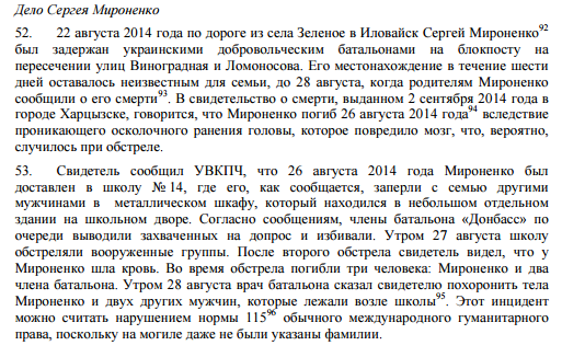Большое внимание в докладе ООН уделено судьбе украинских солдат, захваченных во время отступления из Иловайска. По данным Генеральной прокуратуры, тогда были захвачены около 300 украинских солдат, большинство – 29 и 30 августа. До 10 солдат были захвачены в начале сентября, когда их обнаружили в близлежащих полях.