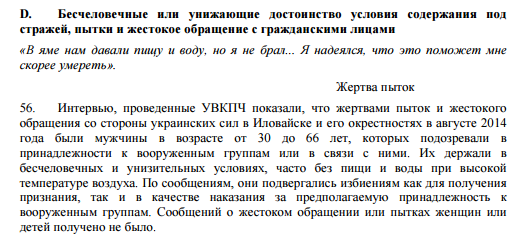Интервью, проведенные миссией ООН, показали, что жертвами пыток и жестокого обращения в Иловайске и его окрестностях в августе 2014 года были мужчины в возрасте от 30 до 66 лет, которых подозревали в принадлежности к вооруженным группам или в связи с ними. Пытки проводились "со стороны украинских сил".