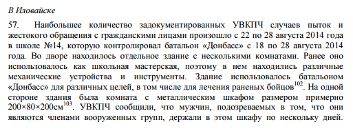 Наибольшее количество задокументированных случаев пыток и жестокого обращения с гражданскими лицами произошло с 22 по 28 августа 2014 года в уже упомянутой школе №14 Иловайска, которую контролировал батальон "Донбасс".