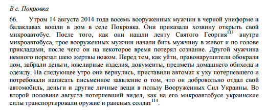 Еще к одному пострадавшему утром 14 августа 2014 года зашли в дом в селе Покровка восемь вооруженных мужчин в черной униформе и балаклавах. После того как нашли "георгиевскую ленту", они начали бить мужчину в живот и по голове прикладами. Он потерял сознание. Жертве порезали шею ножом.