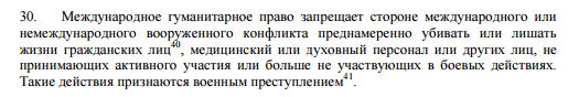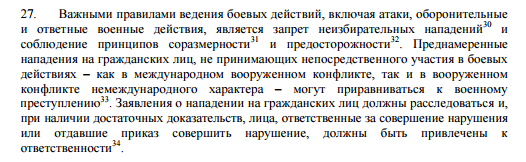Преднамеренные нападения на гражданских лиц, не принимающих непосредственного участия в боевых действиях, могут приравниваться к военному преступлению. Заявления о нападении на гражданских лиц должны расследоваться и, при наличии достаточных доказательств, лица, ответственные за нарушения или отдавшие приказ совершить нарушение, должны быть привлечены к ответственности.