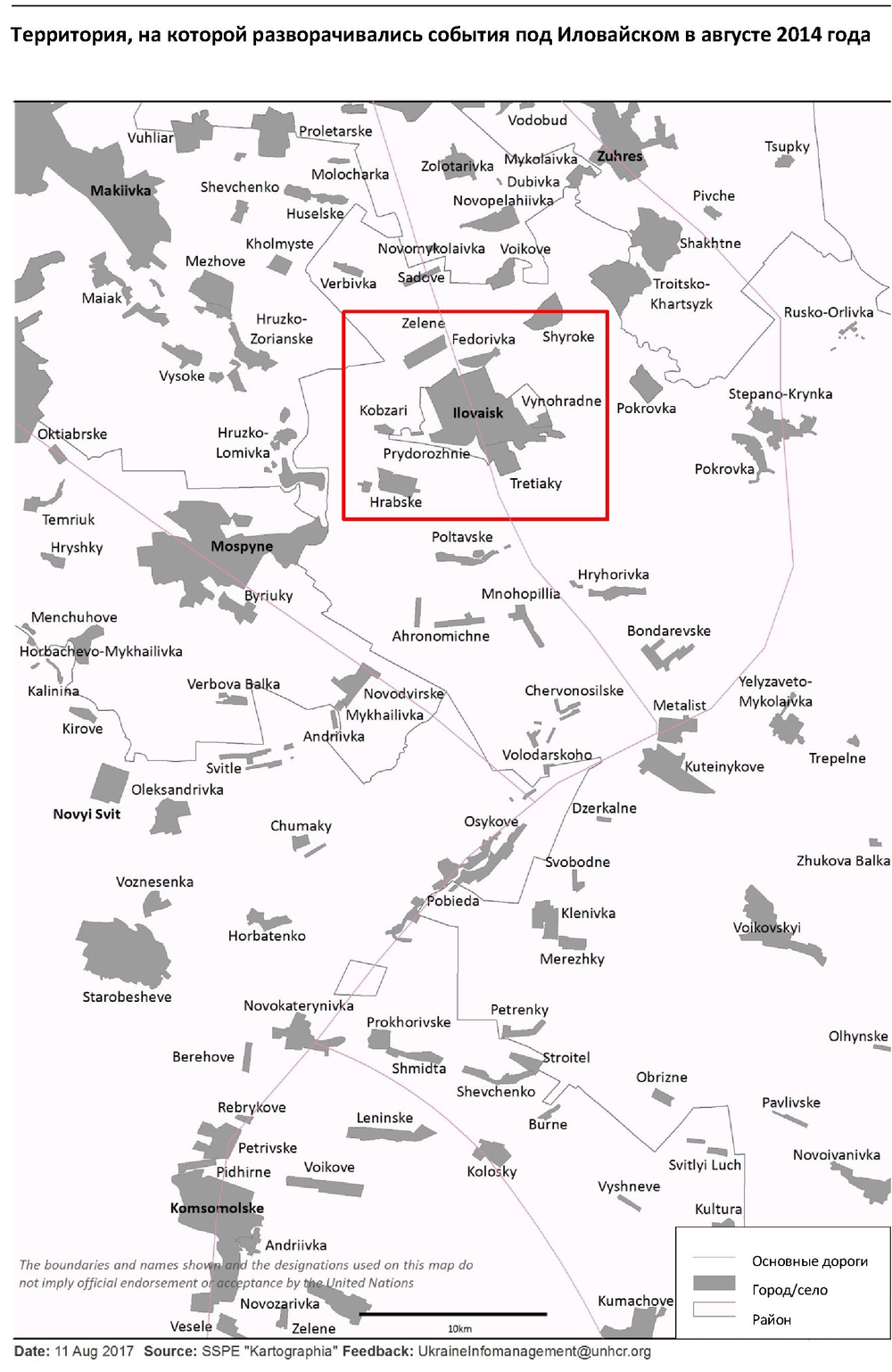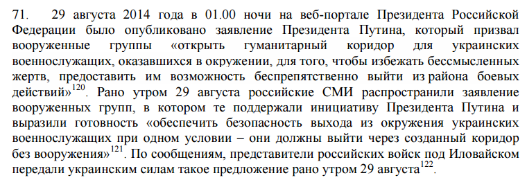 Авторы доклада ООН при описании событий ссылаются на веб-портал президента Российской Федерации, где 29 августа 2014 года в час ночи было опубликовано обращение Владимира Путина. Он тогда призвал вооруженные группы "открыть гуманитарный коридор для украинских военнослужащих, оказавшихся в окружении, для того, чтобы избежать бессмысленных жертв, предоставить им возможность беспрепятственно выйти из района боевых действий".