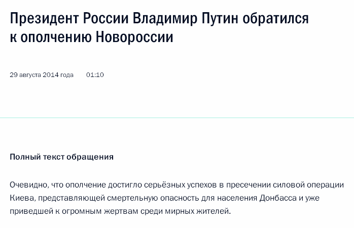 Действительно, на российском президентском сайте до сих пор размещено это обращение Путина. Правда, оно адресовано к "ополчению Новороссии":