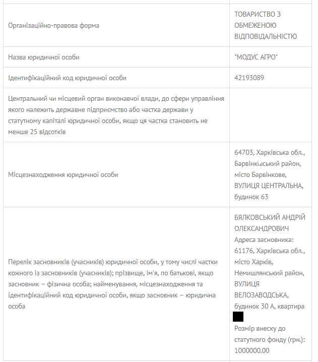 Еще одна структура Андрея Бялковского – созданное в июне 2018 года ООО "Модус Агро". В уставный фонд предприятия он внес миллион гривен.