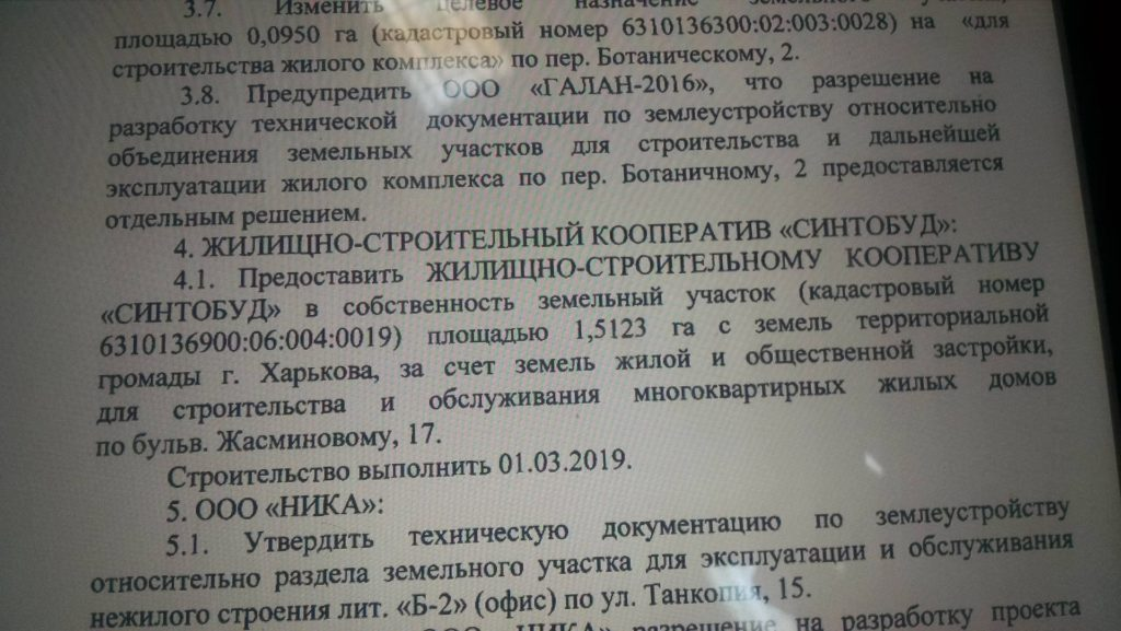 Депутатам горсовета Харькова был представлен для рассмотрения на постоянных комиссиях проект решения о бесплатной передаче земельного участка площадью 1,5123 га в собственность жилищно-строительного кооператива "Синтобуд":