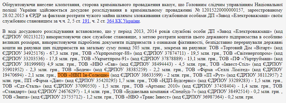 После создания Национального антикоррупционного бюро Украины (НАБУ) расследование по делу о хищениях на "Электротяжмаше" стала вести эта организация. И после смены органа следствия все упоминания об ООО "НВП "Ин-Солюшн" таинственным образом исчезли из судебных документов.
