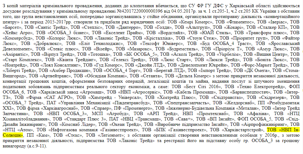 Еще одно уголовное производство, в котором фигурирует ООО НВП "Ин-Солюшн", сейчас расследуют харьковские налоговики. В нем речь идет об отмывании средств в 2015-2017 гг. посредством "конвертационного центра". Злоумышленники, по версии следствия, создали и приобрели ряд юридических лиц, с целью прикрытия незаконной деятельности, конвертации денежных средств, оформление бестоварных операций, легализации денежных средств и имущества и оказания услуг по искусственному уменьшению налоговых обязательств.