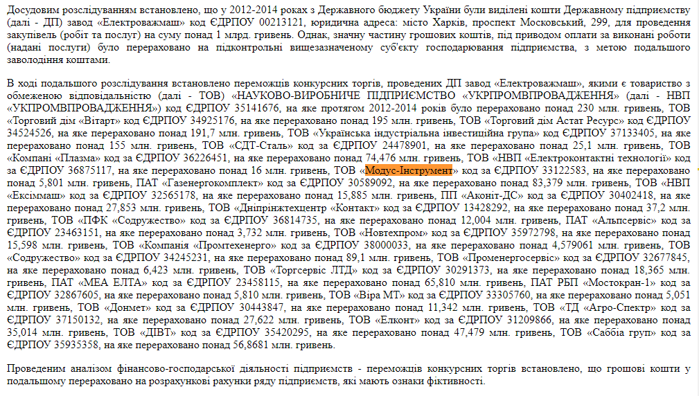 В ходе расследования были установлены победители конкурсных торгов, проведенных заводом "Электротяжмаш". Среди них оказалось ООО "Модус-Инструмент" Андрея Бялковского. На него в течение 2012-2014 годов были перечислены свыше 5,8 млн. грн.