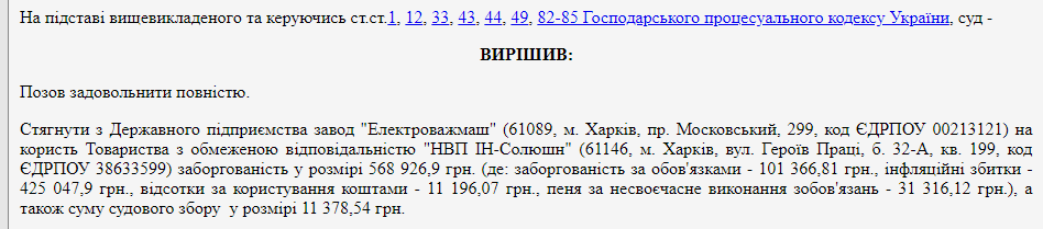 Судья Харьковского хозяйственного суда со знакомой фамилией Светличный 9 сентября 2015 года принял решение, которым взыскал с "Электротяжмаша" в пользу "Модус-Инструмента" 190 тыс. грн. Эта сумма полностью состояла из различных "накруток". Например, сумма пени составила 30,7 тысяч, а еще 159 тысяч гривен пришлось на индекс инфляции.