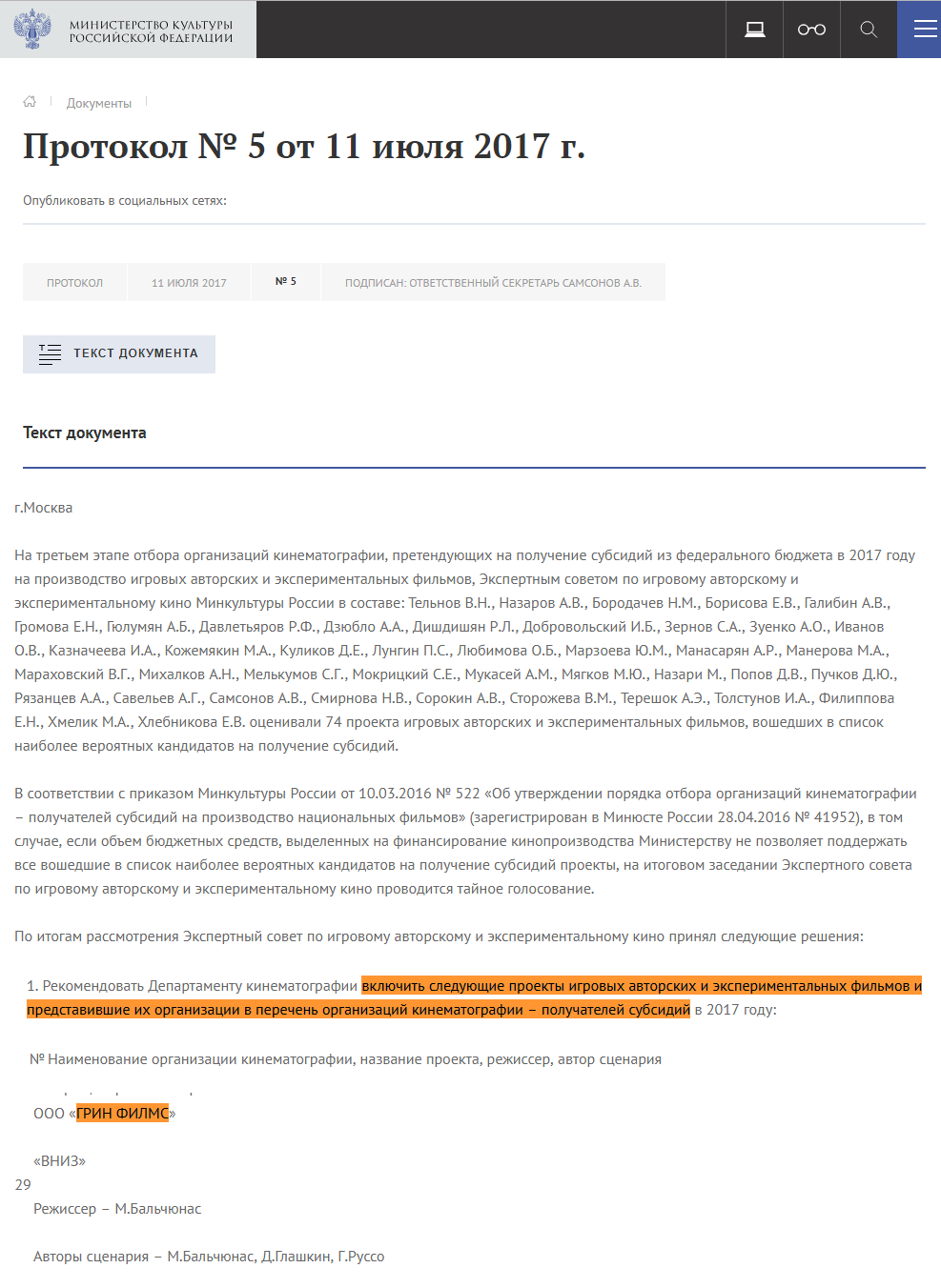 Эта информация подтверждается в протоколе заседания Экспертного совета Министерства культуры Российской Федерации по отбору организаций кинематографии, претендующих на получение субсидий из федерального бюджета в 2017 году: