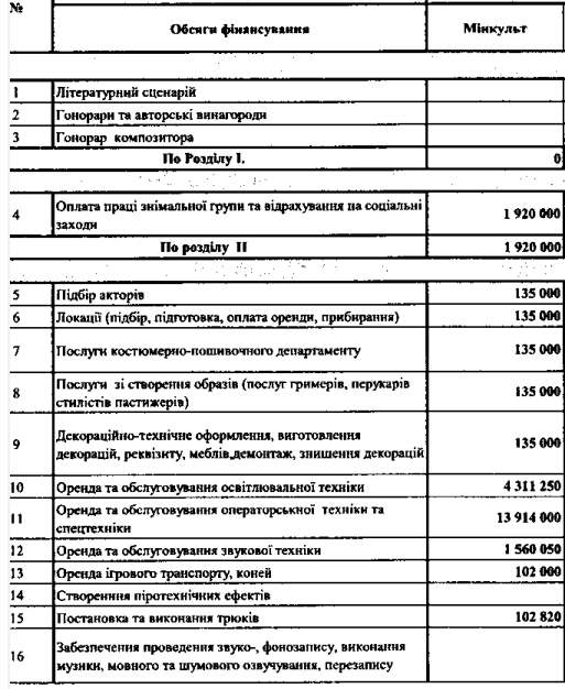 В распоряжение "Страны" попала смета на производство "Гуцульского вестерна". По ней бюджет Украины должен заплатить даже за подготовку трюков и аренду лошадей. А основная сумма бюджетных денег (почти 20 миллионов) идет на аренду и обслуживание различного оборудования:
