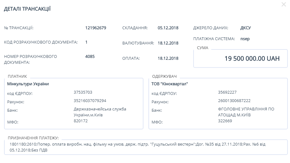 Министерство культуры уже заплатило фирме Зеленского предоплату за производство "Гуцульского вестерна". Согласно сведениям веб-портала  использования публичных средств "Е-дата", аванс в сумме 19,5 млн. был перечислен 18 декабря 2018 года: