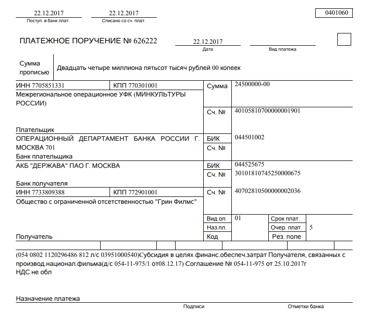 "Страна" нашла на Едином веб-портале бюджетной системы РФ два платежных поручения, которыми на счет ООО "Грин филмс" были перечислены деньги из российского бюджета. 2 ноября 2017 года компания получила 10,5 млн рублей, а 22 декабря – еще 24,5 миллиона: