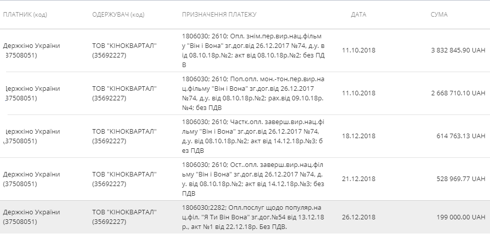 Хотя договор с Госкино был подписан в декабре 2017 года, платежи по нему шли больше года. Согласно данным "Е-дата", 8,9 млн фирма Зеленского  получила от Госкино в июне, а еще 7,8 млн. грн. – в октябре и декабре 2018 года: