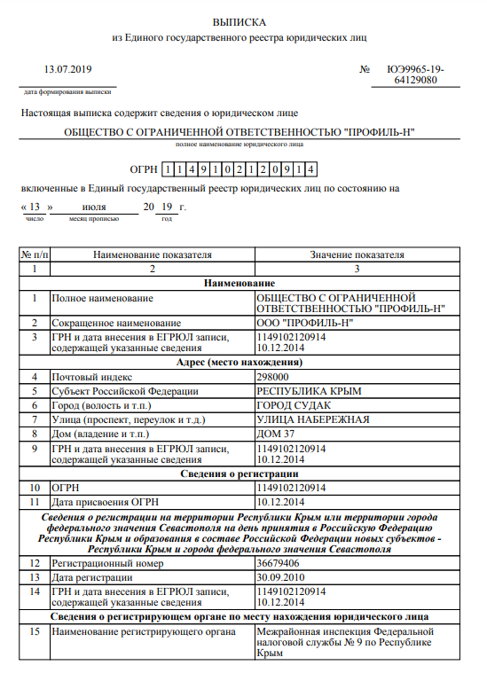 "Страна" взяла выписку из российского реестра юридических лиц. В нем указано, что фирма с тем же названием (ООО "Профиль-Н"), по тому же адресу и с теми же учредителями (Наум Баруля и Ирина Борзова) была зарегистрирована в Федеральной налоговой службе РФ по Республике Крым 10 декабря 2014 года: