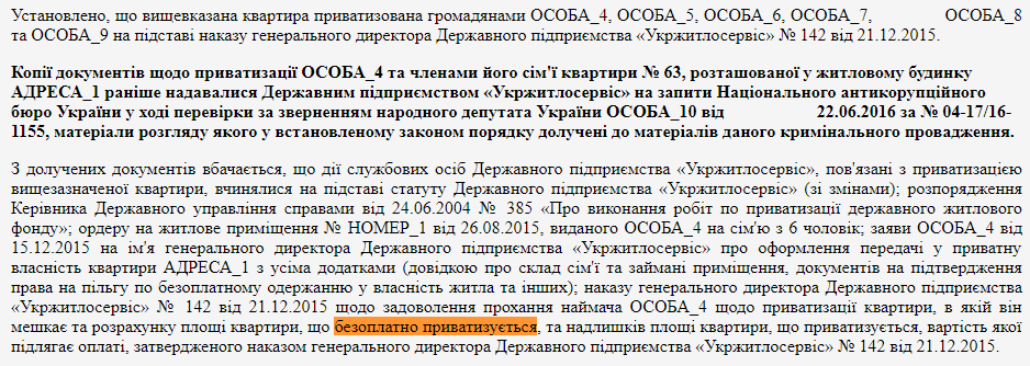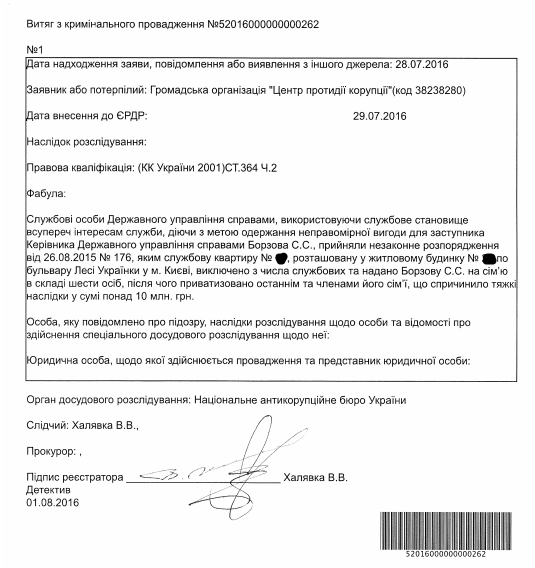 Согласно фабуле дела, должностные лица ДУСи, используя служебное положение, приняли незаконное распоряжение об исключении квартиры Сергея Борзова из числа служебных, чем нанесли ущерб на сумму свыше 10 млн. гривен. Это говорится в выписке из уголовного производства, которую опубликовал "Центр противодействия коррупции":