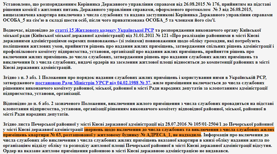 В одном из определений суда по этому уголовному производству был показан механизм незаконной приватизации. Оказывается, квартира была выведена из числа служебных распоряжением руководителя ДУСи 26 августа 2015 года. Напомним, что в это время Сергей Борзов уже был назначен и.о. руководителя этого учреждения.