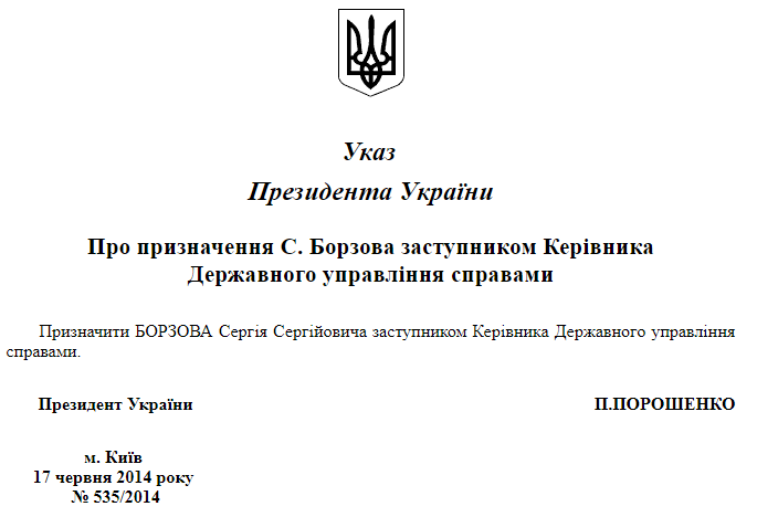 Президент Петр Порошенко назначил Сергея Борзова на должность заместителя главы ДУСи еще в июне 2014 года: