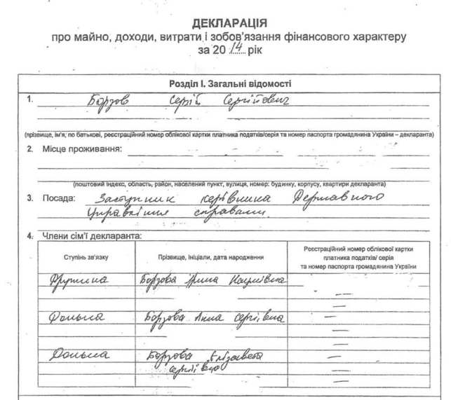 Поначалу в декларации за 2014 год Сергей Борзов сообщал, что живет только с женой и двумя детьми: