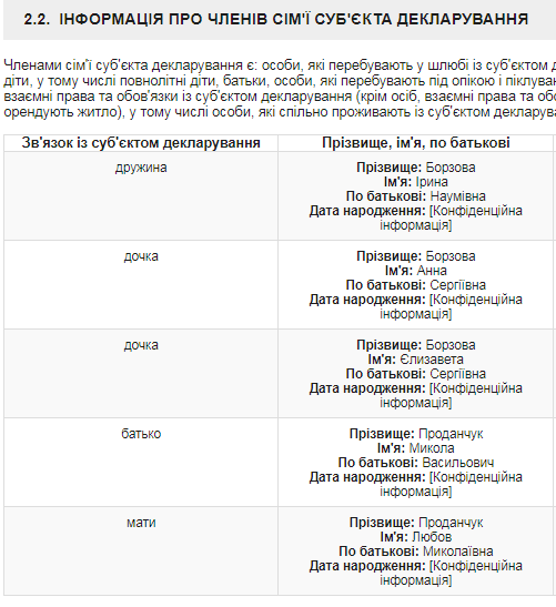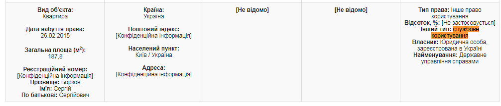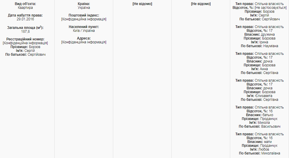 После этого, согласно декларации за 2016 год, 187-метровая квартира в Киеве превратилась из служебной в частную. При этом она стала совместной собственностью шестерых владельцев - самого Сергея Борзова, его жены, двоих детей и родителей:
