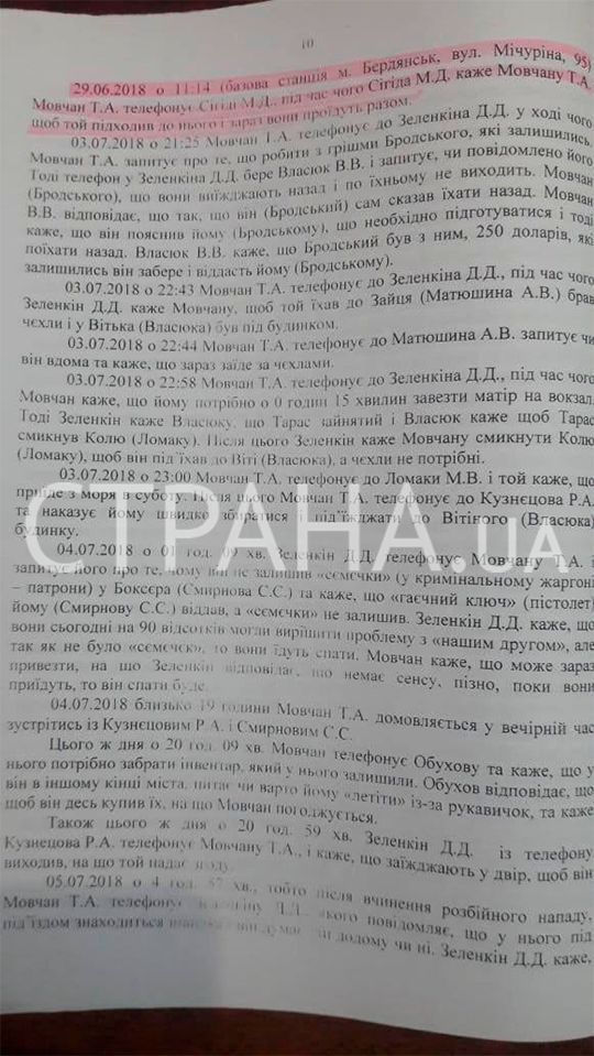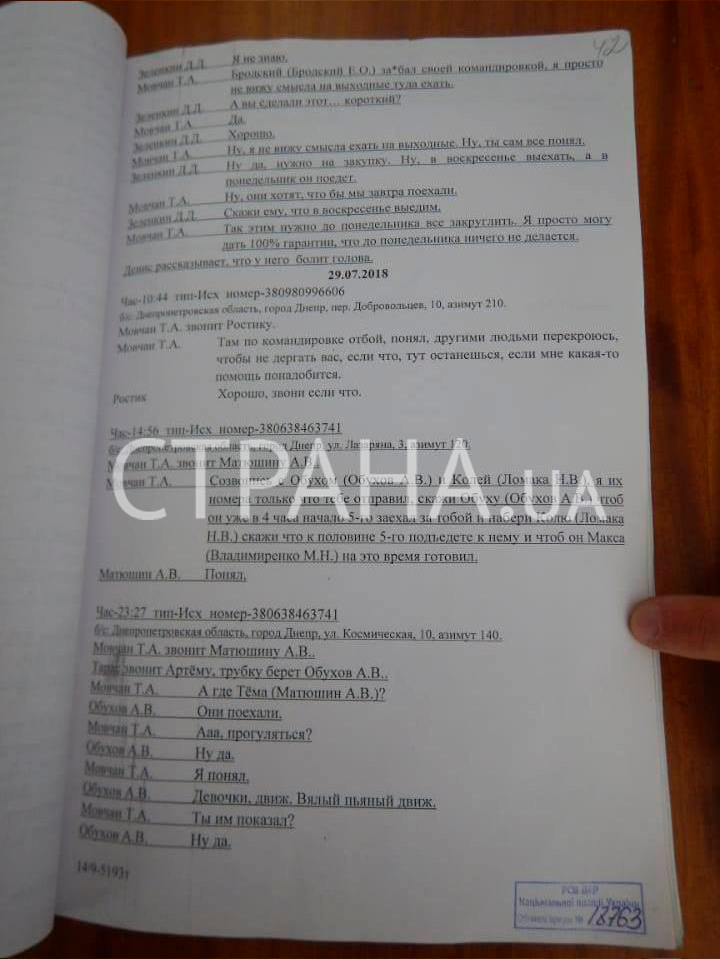 Судя по материалам прослушки, координатором днепровской ОПГ был Тарас Мовчан – именно его разговоры по мобильному телефону и прослушивала полиция. Вот разговор Мовчана с Зеленкиным 26 июля 2018 года (приводим с сокращением – Ред.). Речь идет о формировании группы киллеров из Днепра, задача которых - убить Олешко.