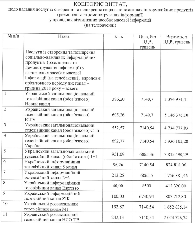 В рамках этих двух договоров Минстець размещал на телеканалах рекламные ролики, которые поддерживали лозунги и риторику экс-президента Петра Порошенко.