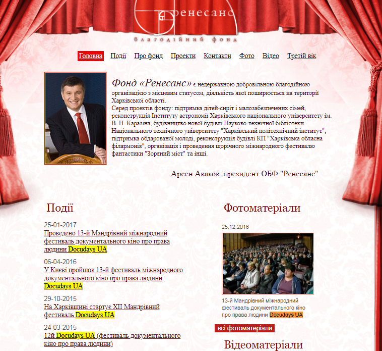 Эта организация - тоже с харьковской "пропиской", и тоже относится к сфере влияния Арсена Авакова. На сайте благотворительного фонда "Ренессанс", президентом которого указан Арсен Аваков, почти все новости, начиная с 2015 года, посвящены проведению этого фестиваля: