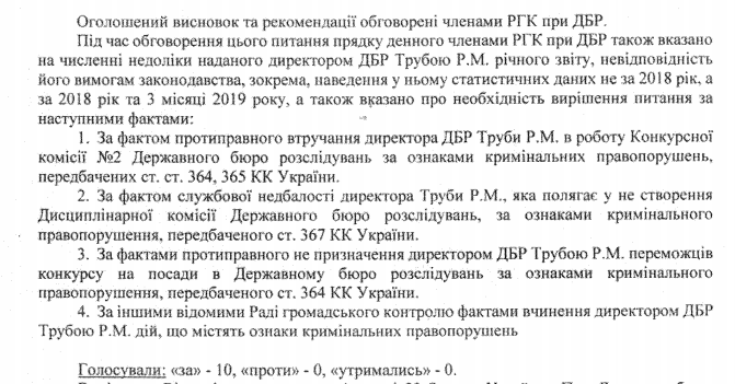 Еще Совет дал крайне негативную оценку отчету о деятельности ГБР за 2018 год, который представил Роман Труба. Члены Совета обвинили Романа Трубу во множестве действий, которые, по их мнению, подпадали под действие Уголовного кодекса. Данные обвинения отражены в протоколе заседания Совета при ГБР от 21-26 марта 2019 года: