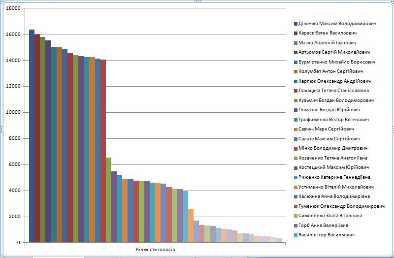 На этом графике отчетливо видно, что количество голосов, поданных за 15 победителей голосования резко отличается от количества голосов, поданных за других кандидатов.