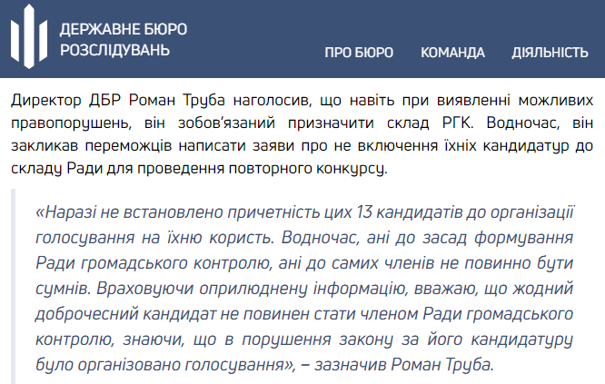 Тем не менее, даже констатировав факт возможных массовых фальсификаций при голосовании в Совет ГБР, директор ведомства Роман Труба отметил, что он обязан назначить состав данного совета.