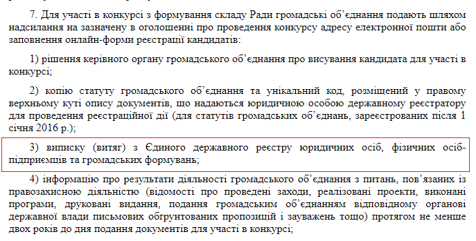 Например, согласно требованиям пункта 7 (подпункт 3) утвержденного Кабмином Порядка формирования Совета при ГБР, общественные организации, которые выдвигают своих кандидатов, должны, среди прочих, предоставить выписку из Единого госреестра юридических лиц: