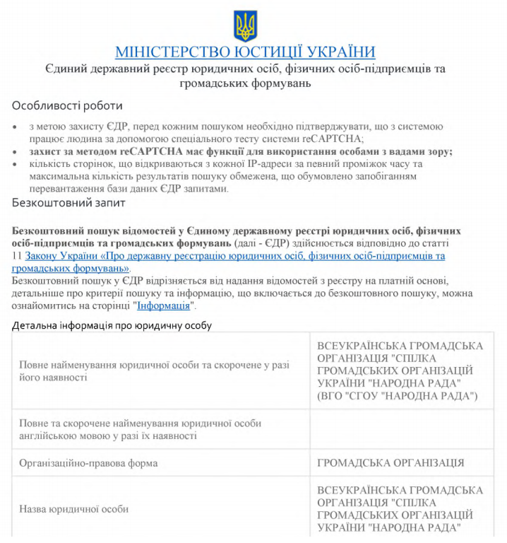Однако общественная организация СГОУ "Народная Рада" вместо выписки из госреестра предоставила скрин-распечатку с сайта Министерства юстиции, содержащий информацию об организации: