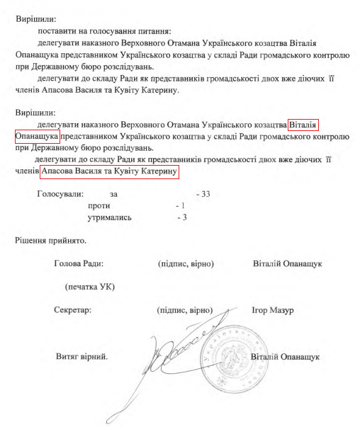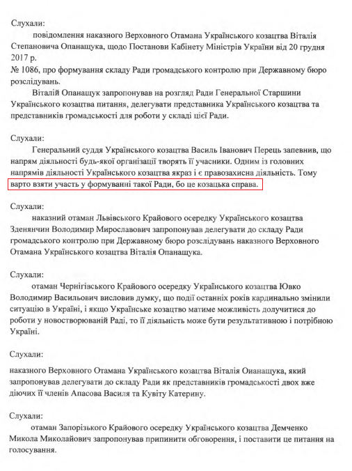 Например, согласно протоколу, "Генеральный судья Украинского казачества" сообщил на собрании, что надо принять участие в формировании Совета при ГБР, "бо це козацька справа":
