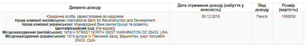 В нем он указал, что 9 декабря этого года получил доход в сумме 1 млн 56 тыс гривен в качестве пенсии от Международного банка реконструкции и развития (МБРР), расположенного в столице США городе Вашингтоне: