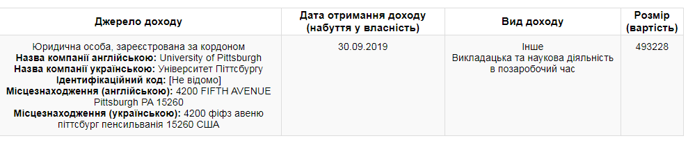И еще почти полмиллиона гривен министр получил в сентябре в Питтсбургском университете с формулировкой "за преподавательскую и научную деятельность во внерабочее время":