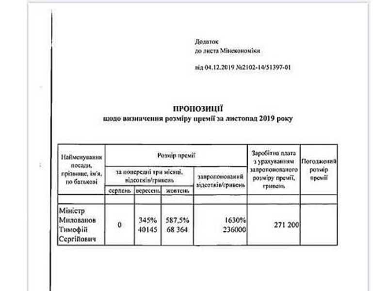 Как сообщалось ранее, по данным нардепа Александра Дубинского, Милованов может получить за ноябрь премию в 1630%, что равняется 236 тыс. грн.: