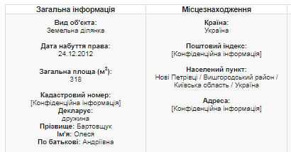 Начиная с 2015 года, Руслан Рябошапка постоянно декларирует, что его жене принадлежит половина участка с домом в селе Новые Петровцы (Вышгородский район под Киевом). Например, в последней из поданных деклараций он указал, что Олеся Бартовщук владеет 50% квартиры на 150 "квадратов" и половиной участка площадью 318 квадратных метров в Новых Петровцах.