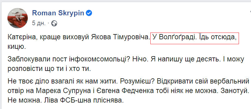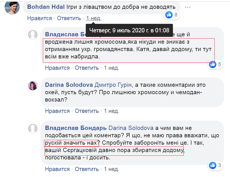 В субботу, 11 июля, он опубликовал в своем Facebook фото шеф-редактора "Забороны" Екатерины Сергацковой с пятилетним сыном, обвинил журналистку в том, что она является "агентом Кремля" и предложил ей уезжать в Россию.