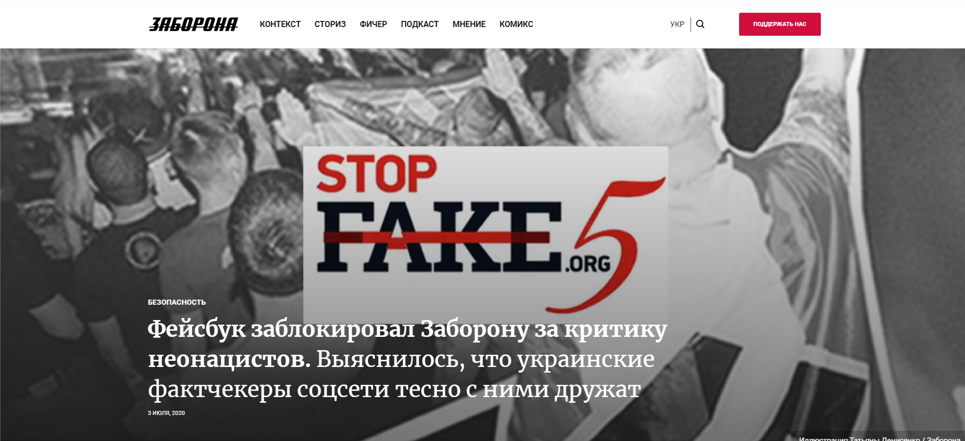 Конфликт начался с того, что интернет-издание "Заборона" (с укр. "Запрет") 3 июля опубликовало статью "Фейсбук" заблокировал "Заборону" за критику неонацистов. Выяснилось, что украинские фактчекеры соцсети тесно с ними дружат".