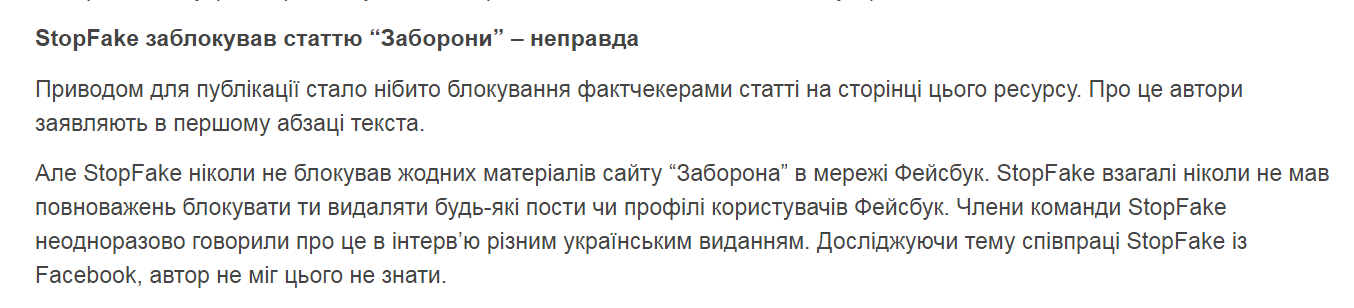 Сначала StopFake заявил, что блокировка ним статьи "Забороны" – это неправда: "Поводом для публикации стала якобы блокировка фактчекерами статьи на странице этого ресурса. Об этом авторы заявляют в первом абзаце текста. Но StopFake никогда не блокировал никаких материалов сайта "Забороны" в сети "Фейсбук":